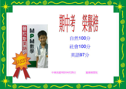 101年下學期期中考榮譽榜--中年級